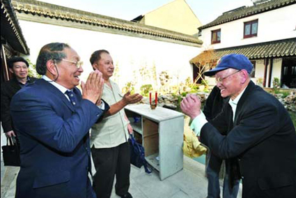 4月11日下午,在大儒巷的丁宅内,旅居澳洲的丁家后人丁兆璋(左二)、丁兆庆(左三)兄弟拜访在苏的丁家前辈。 记者 徐志强 摄