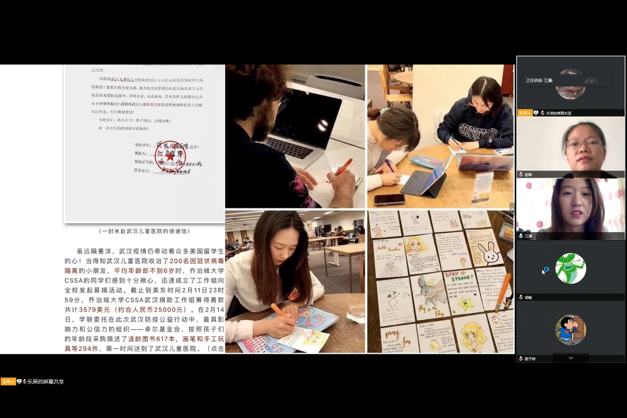 社科学院2015级校友、美国乔治城大学2019级硕士生江澜从留学生的视角,分享了国际视角下的抗疫故事。国内疫情暴发初期,她所在的乔治城大学与武汉某儿童医院对接,组织了物资募捐活动,并请不同国家的学生写明信片鼓励当地儿童。虽然1月底在线平台上已经无法买到医用口罩,但乔治城大学的留学生们仍多方渠道收集口罩,并将口罩寄回祖国。