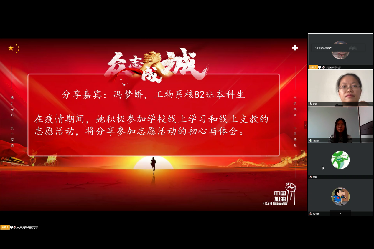工程物理系核82班的冯梦娇分享了自己参与在线教学和线上支教志愿活动的初心和体会。在新冠疫情暴发初期,冯梦娇主动参与志愿活动,为没有经验的老师介绍在线教学软件的使用方法,为老师调试设备并及时解决授课时遇到的技术问题。她还参加了线上支教的“春霖”行动,为受疫情影响严重地区的高中生答疑,并为他们分享学习经验。