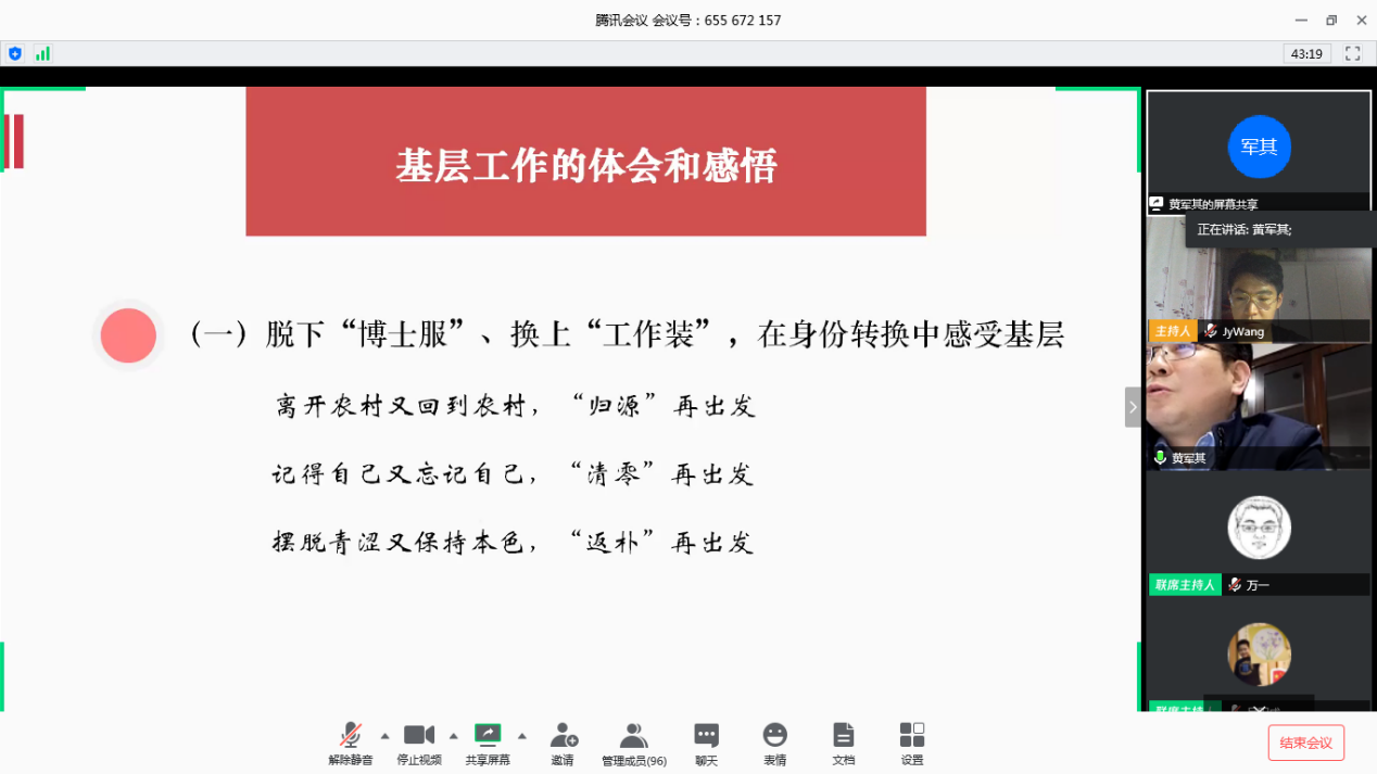 随后,黄军其也分享了抗击疫情过程中的工作体会。他在信访部门工作,前段时间信访工作因疫情暂停开放来访接待窗口,但是通过来信和网络反映问题和解决矛盾的渠道一直都保持畅通。疫情结束后,许多老问题和疫情导致的新信访问题叠加,带来了更大的工作压力,但工作人员始终以敬业的态度认真对待老百姓的每一个问题。保百姓心安,护社会稳定,就是信访部门在全民抗疫中必须扛起的“硬核”担当。