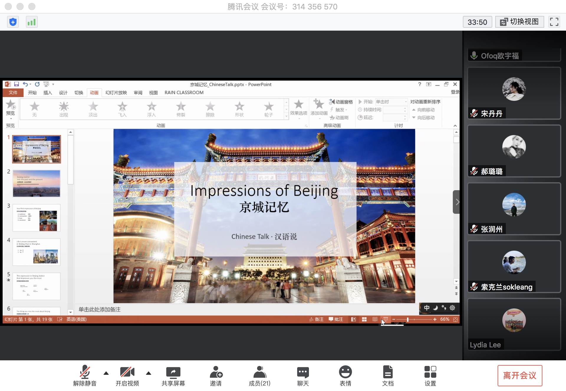 清华新闻网5月29日电(通讯员 冯文欣)5月24日晚,“汉语说”工作坊之“京城印象(Impressionof Beijing)”专场在“云”上如期举行,本次活动吸引了来自6个院系、9个国家和地区的10余名国际生参加。在疫情防控时期,本学期的“汉语说”移步线上,通过网络搭建起了一座中外学生沟通交流的桥梁,保证中外学生跨文化交流“不断线”。