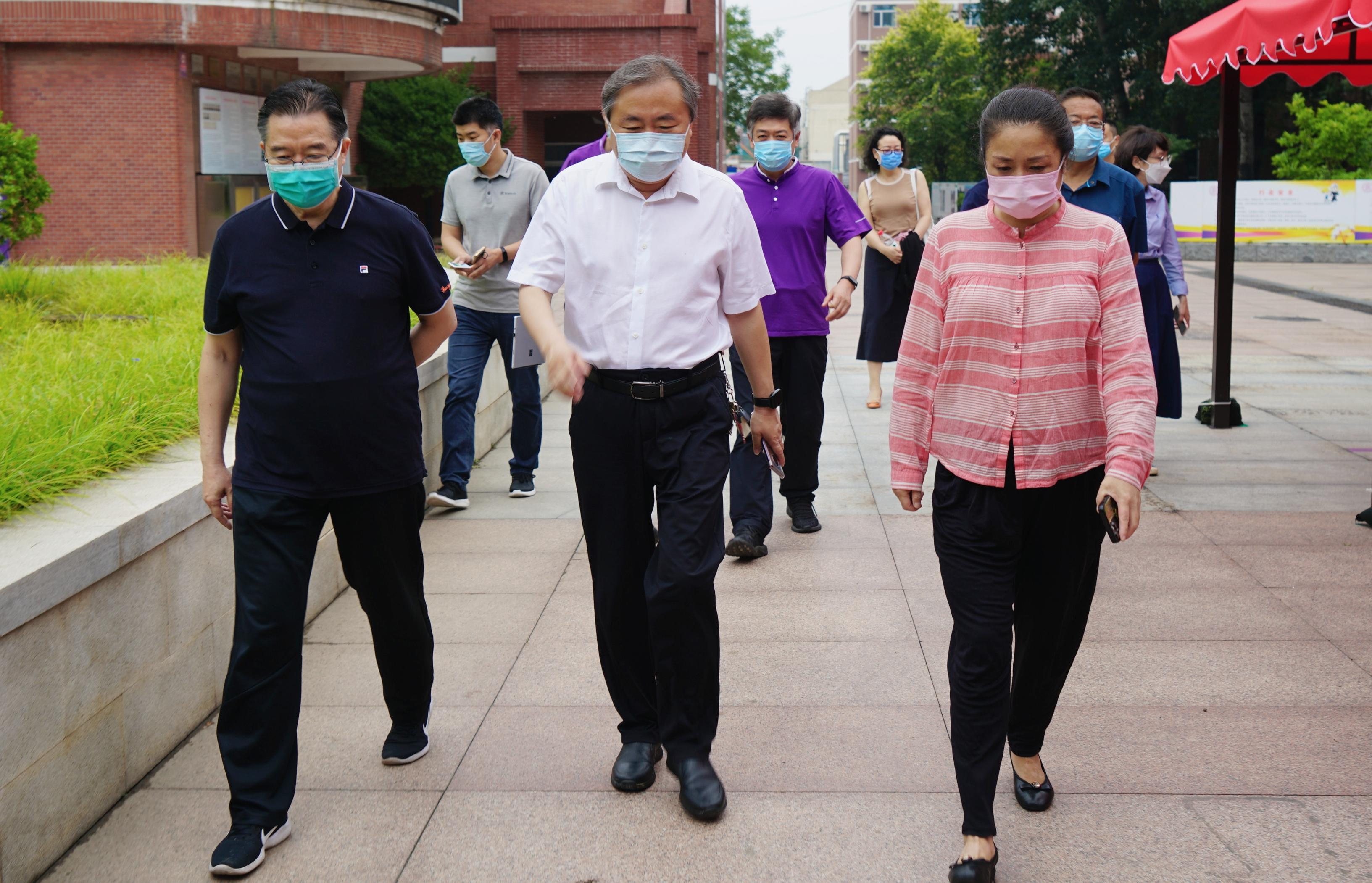 王方(中)实地察看校园,王殿军(左)、方妍陪同检查(右)。