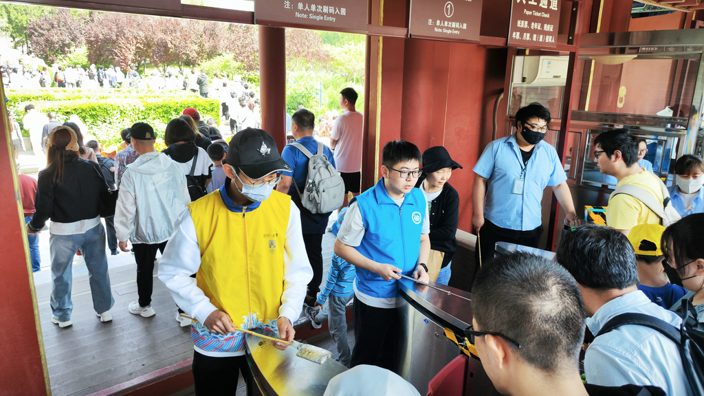 5月1日5日期间,上岗志愿者增加至20人。在检票口,志愿者们帮助引导未成年研学团及老年人等进行人工检票。